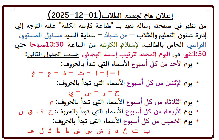الطالب الذي يرسل صورة ليست بالمواصفات الصالحة لوضعها علي كارنيه الكلية سوف لا يتم طباعة الكارنيه الجامعي له
